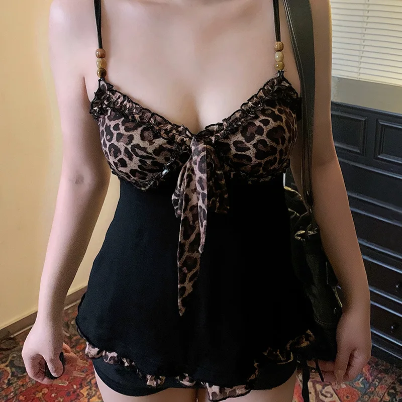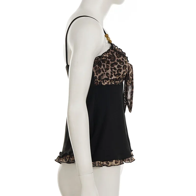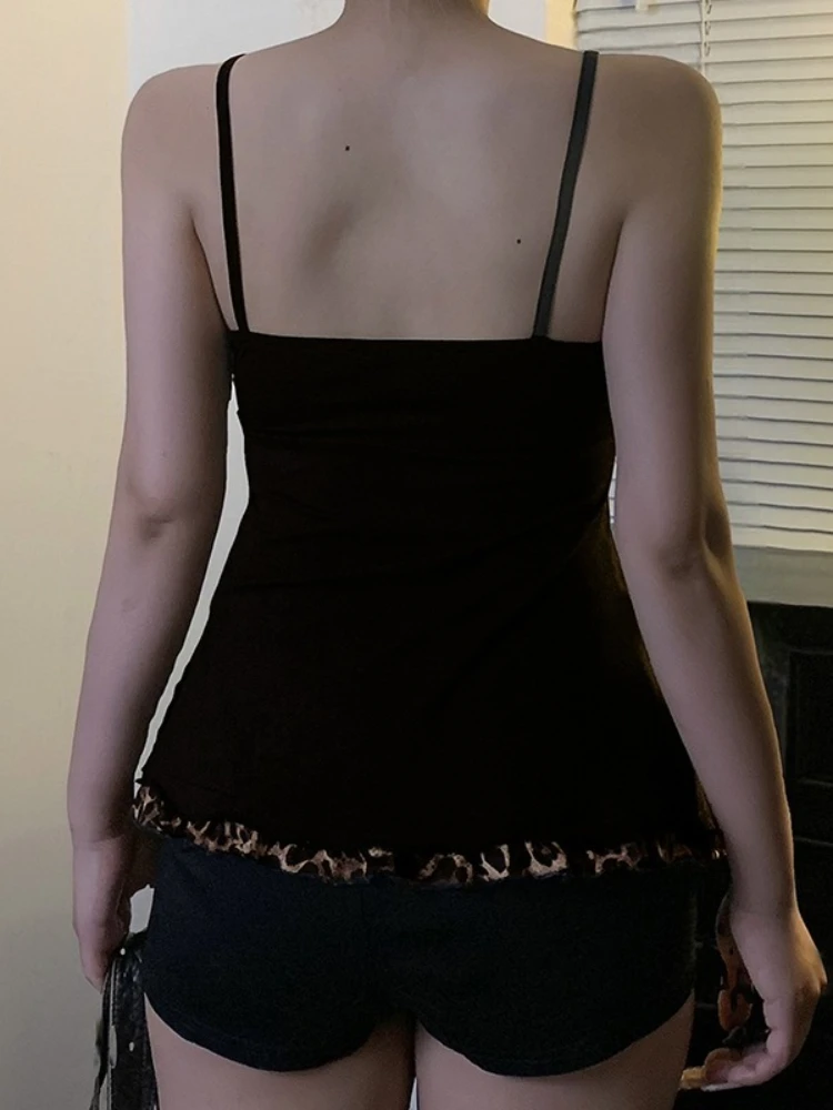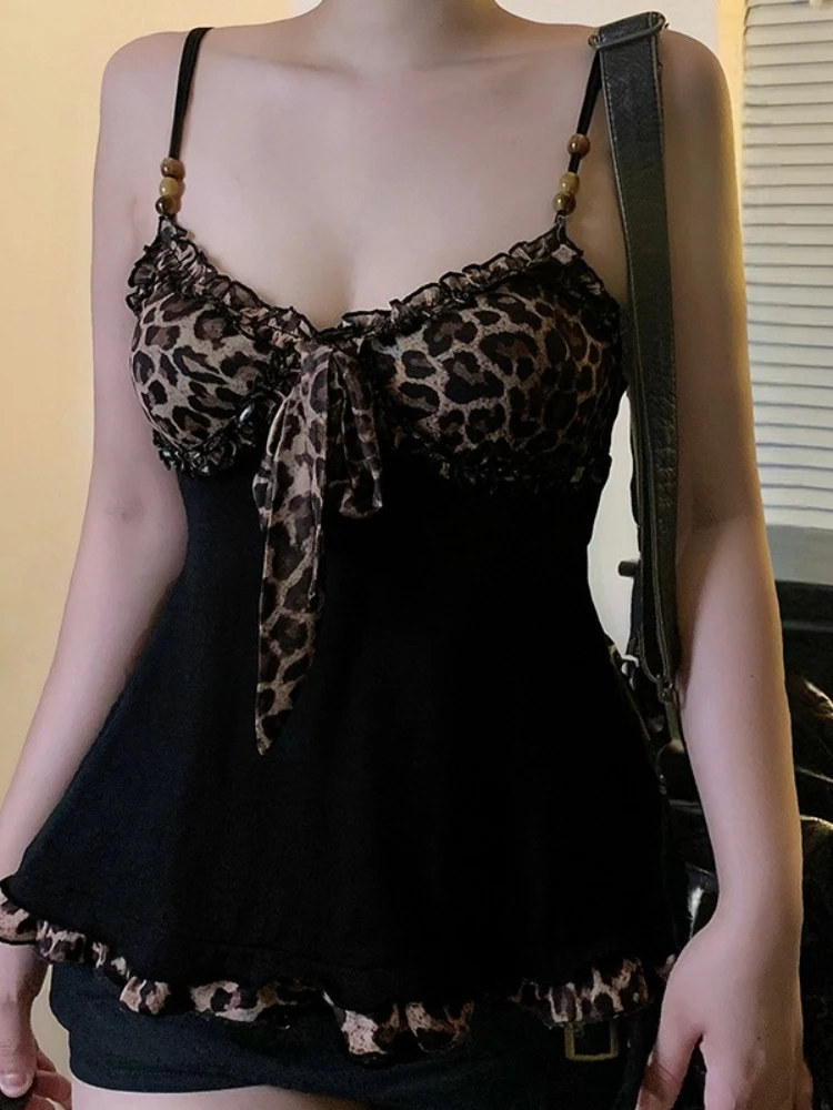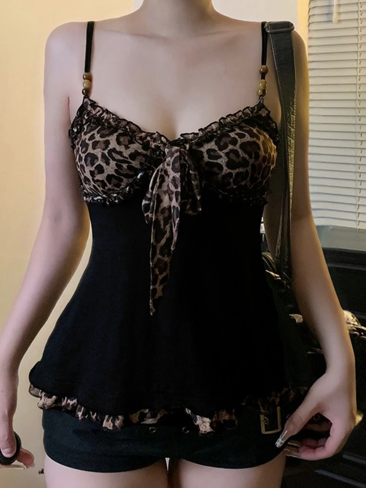 American Hotsweet Y2k Leopard Camisole Women Retro Streetwear E-girl 90s Dark Gothic Sexy Patchwork Lace-up Crop Tank Top Femme